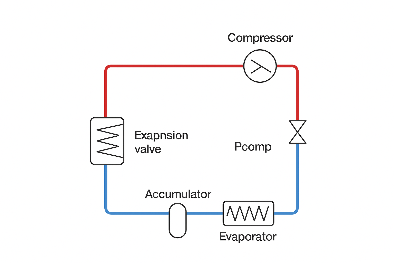 نقشه شماتیک ساده از سیکل تبرید که محل قرار گرفتن آکومولاتور را نشان می دهد.
